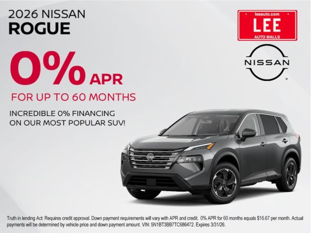 - Customer Cash/Rebate Offer: $3,500 cash back on select 2026 Nissan RogueDetails