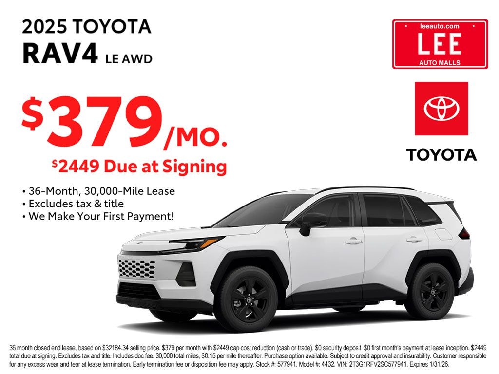 Silver Sky Metallic 2025 Toyota RAV4 LE AWD 8-Speed Automatic 2.5L 4-Cylinder DOHC Dual VVT-i AWD, Blk Fabric Cloth, 17" Steel Wheels, All Weather Floor Liners & Cargo Liner (TMS), Blind Spot Monitor w/RCTA.Recent Arrival! 27/34 City/Highway MPGPricing does not include tax, title or $649 dealer doc fee.
